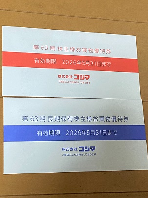 今年もコジマから配当金と株主優待券が届きました。今回は通常分の1,000円に加え、長期保有2年以上の優遇分として2,000円が加算され、合計3,000円分をいただきました。