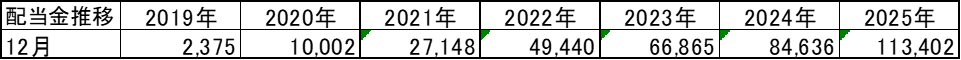 昨年同月(2024年12月)の配当金 84,636円 と比べると、28,766円の増加。着実に右肩上がりです。