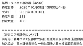 IPO ライオン事務器(423A)IPO当選 企業紹介 2025年10月15日に新規上場するライオン事務器(423A)の紹介をします。 ライオン事務器は、文具・事務用品、オフィス家具・事務機器を製造販売するほか、オフィス環境のデザイン・施工・内装工事・ICT機器を文教市況... 2025.10.10 IPO